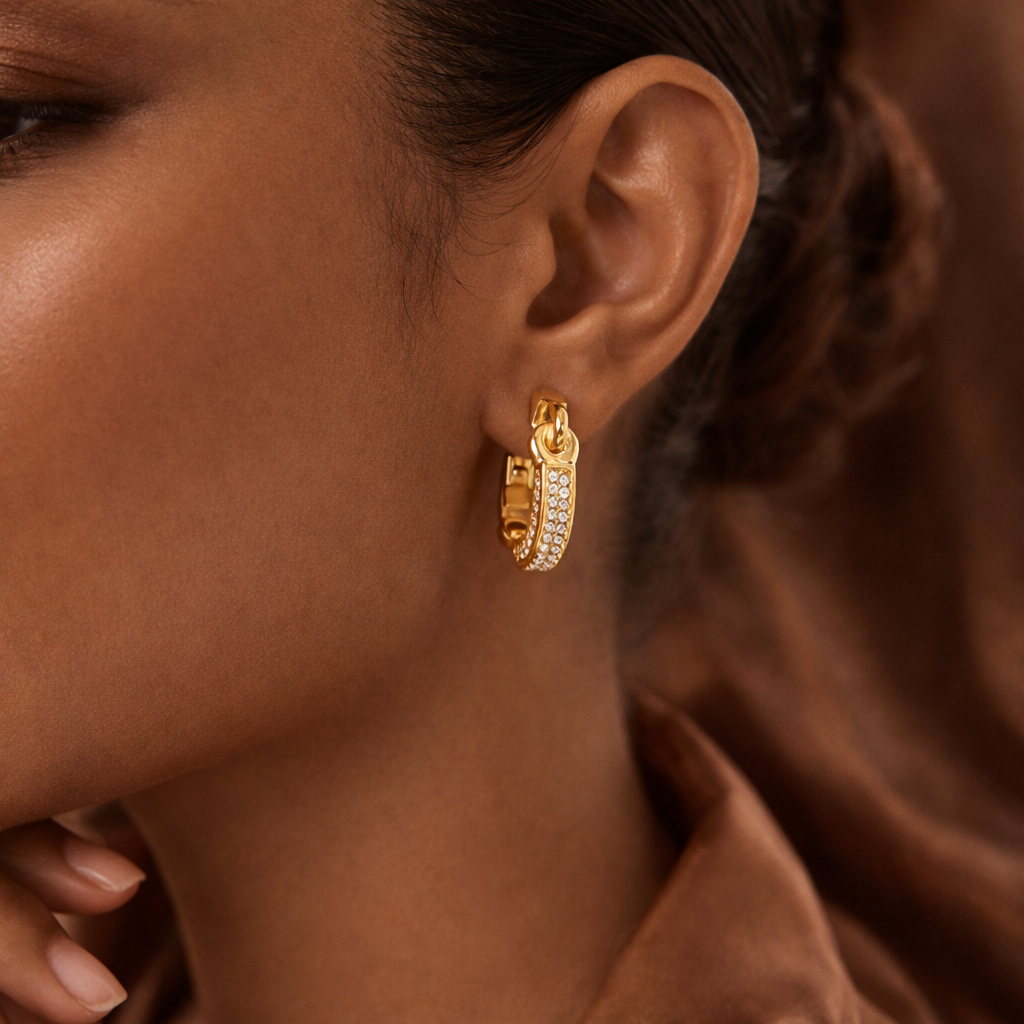 The Quiet Luxury Huggies are designed for women who appreciate quality, detail, and ease. With a sleek link-inspired silhouette and subtle pavé accents, these huggies deliver just the right amount of shine refined, effortless, and undeniably put together.