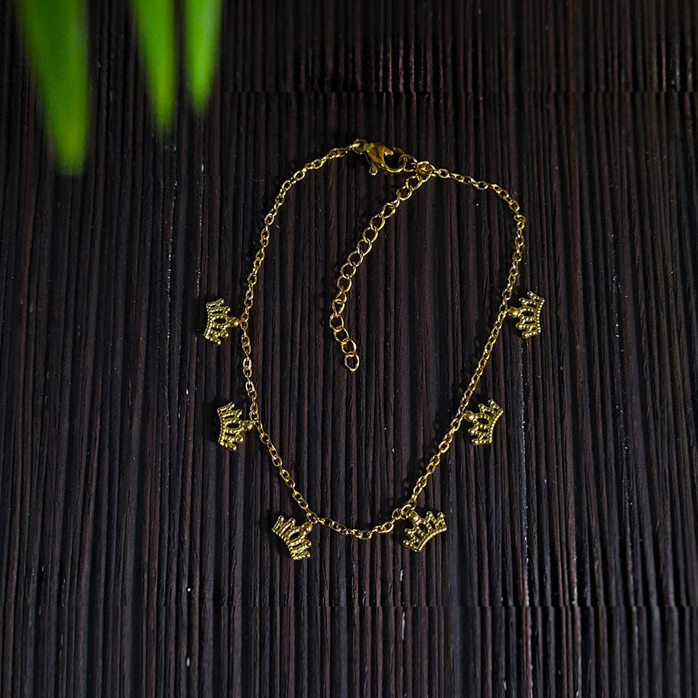 Introducing the Royal Crown Gold Anklet—where queens rule, and crowns are a must-have! Crafted in 18k PVD gold on stainless steel, this anklet is not just fashionable but also the go-to accessory for queens who know how to own their style. Hypoallergenic and color-change-resistant, it's the worry-free glam you need. No princess vibes here—only queens allowed to wear their crowns with pride. Whether you're strutting through the city or conquering your daily kingdom, the Royal Crown Gold Anklet is your regal touch. Rule your realm and snag yours now!