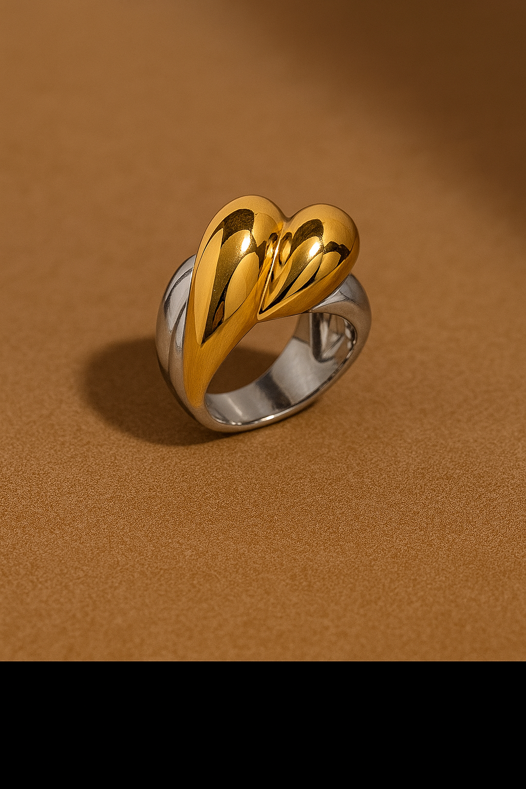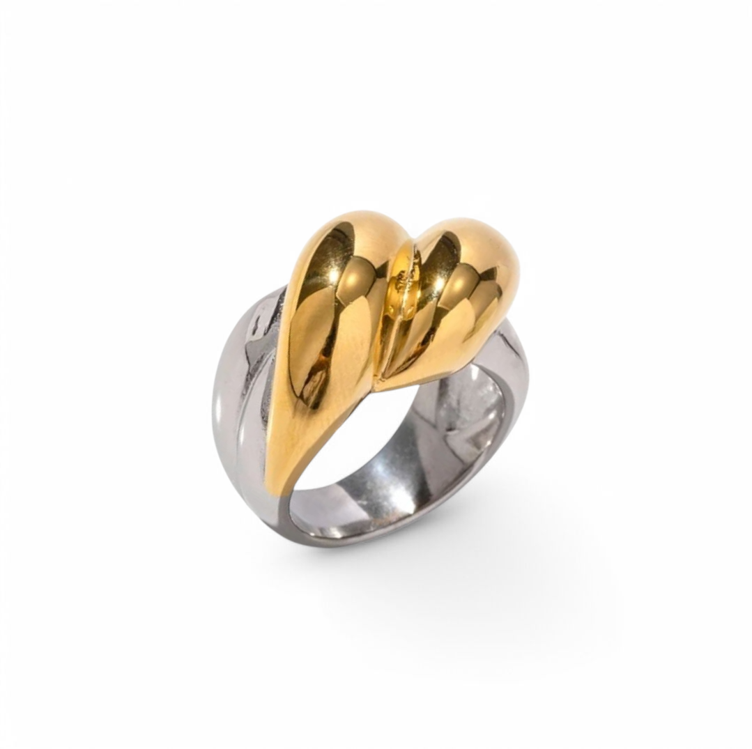 Celebrate the union of contrast and connection with the Divine Duality Ring. Featuring a sculptural, high-polish heart motif in radiant 18k gold atop a cool silver-toned band, this piece is bold, modern, and full of meaning. Whether worn as a symbol of self-love or shared love, its dimensional silhouette turns heads while remaining comfortably lightweight. Hypoallergenic, tarnish-free, and water-resistant—just like love should be.