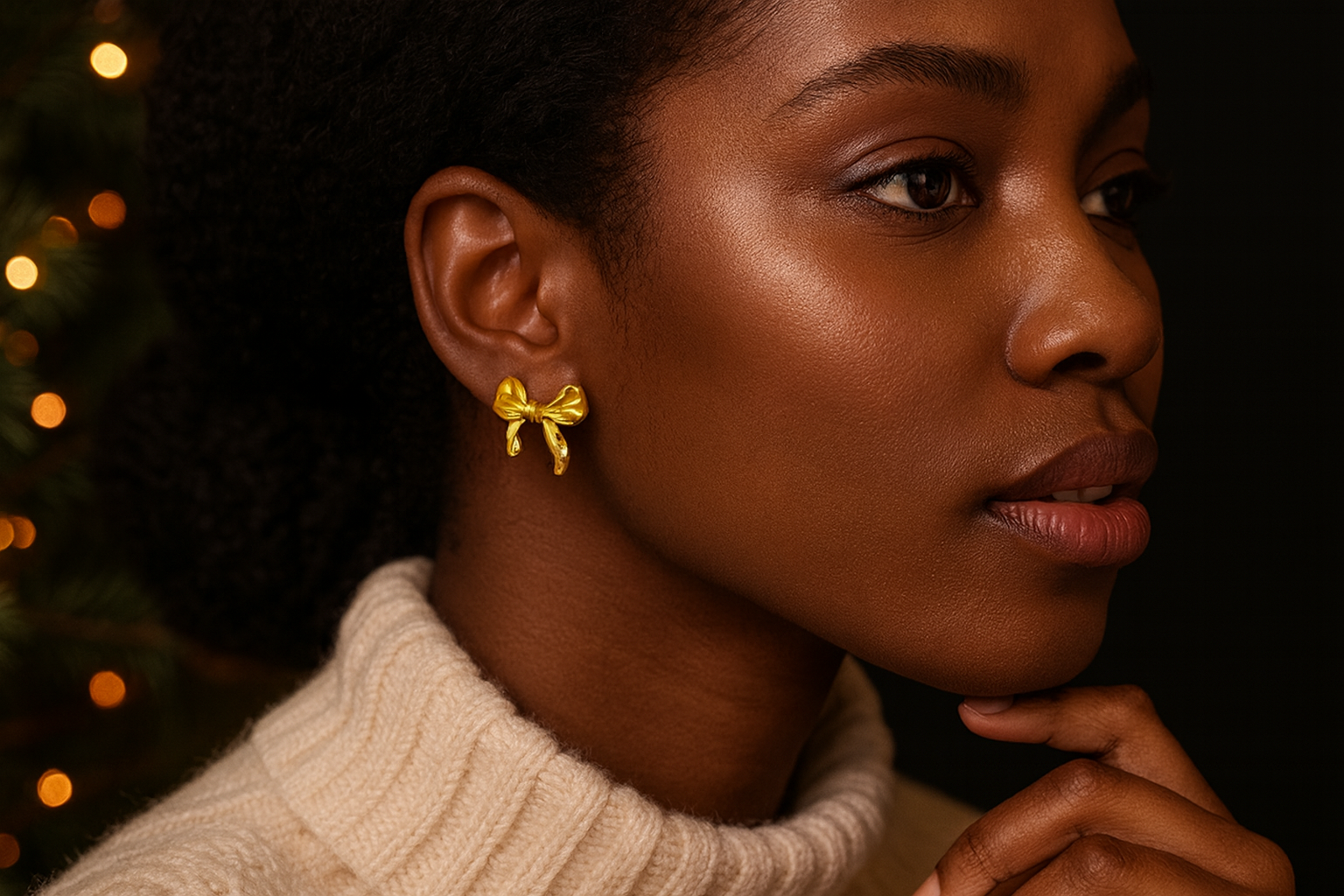 Tie your look together with effortless holiday charm. Our Holiday Bow Earrings bring a touch of festive elegance to any outfit — lightweight, polished, and beautifully sculpted to reflect the glow of the season. Their luxe gold finish captures the magic of holiday lights, making them the perfect accessory for gatherings, gifting, or elevating your everyday winter style.