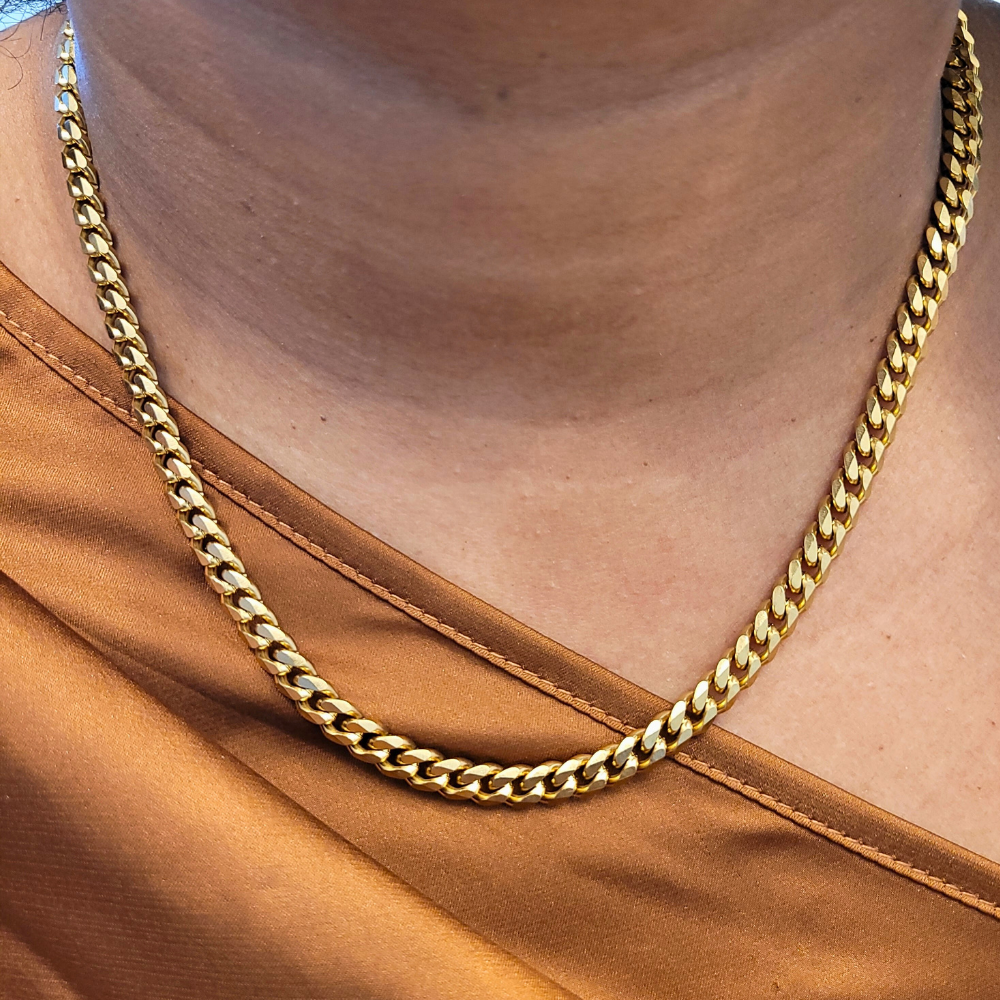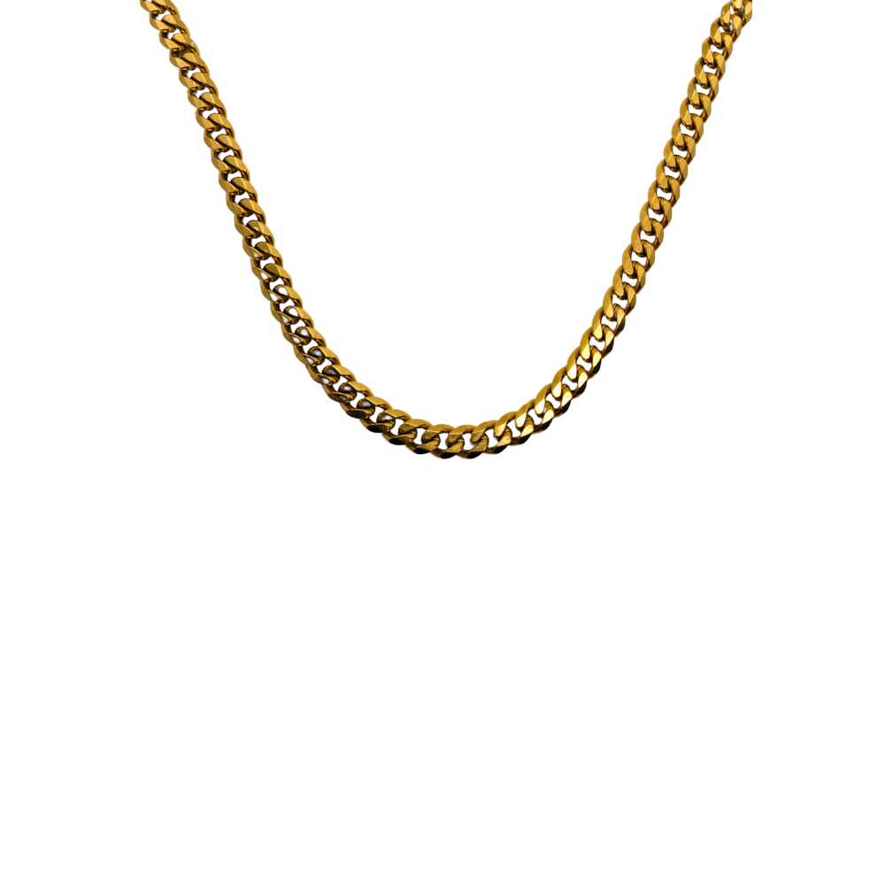 Make a bold statement with the Regina Curb Gold Necklace, a weighted piece with a 3mm thickness crafted from 18K PVD gold-plated stainless steel. Perfect for those seeking a strong presence in their jewelry, this necklace is water-resistant and tarnish-resistant. The adjustable feature ensures a comfortable fit, making it a distinctive addition to your collection.