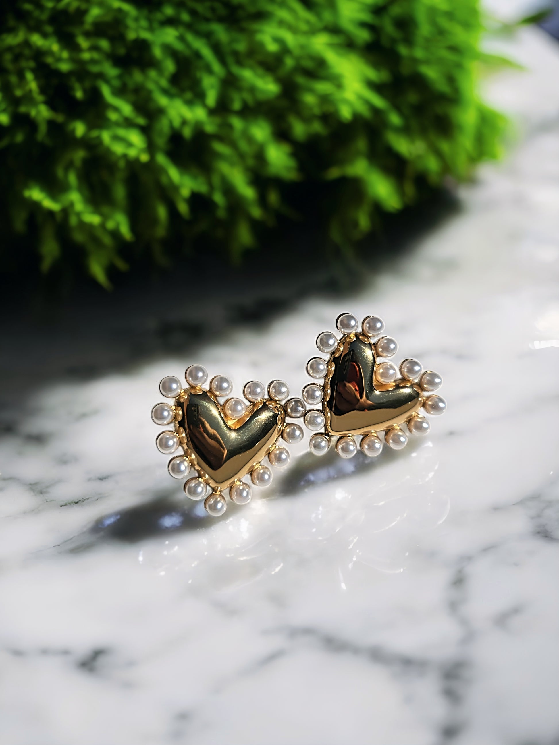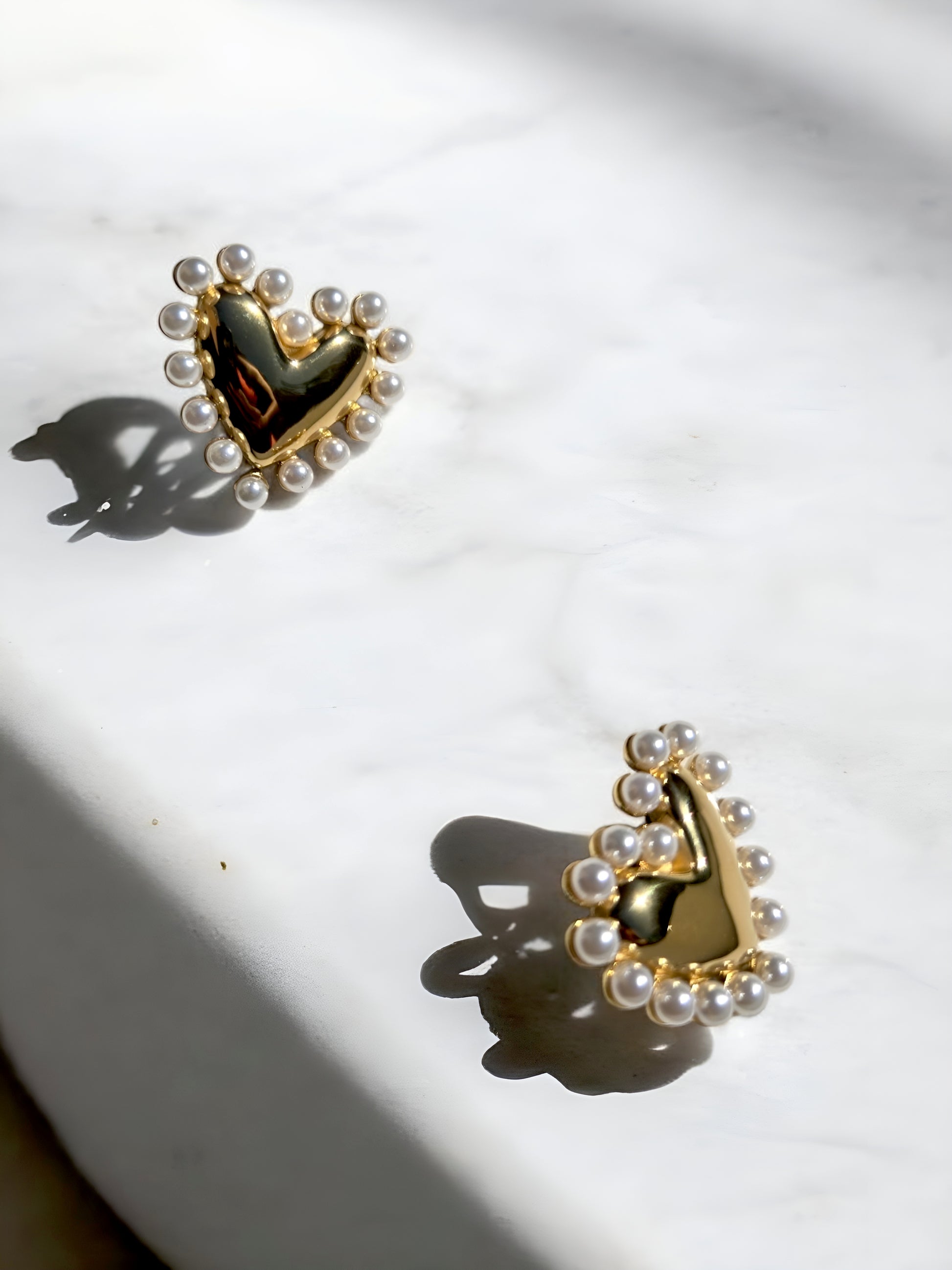 Feminine and fearless. These heart-shaped earrings are framed with dainty faux pearls, striking the perfect balance between vintage charm and bold expression. Hypoallergenic and tarnish-free for wear-all-day elegance.