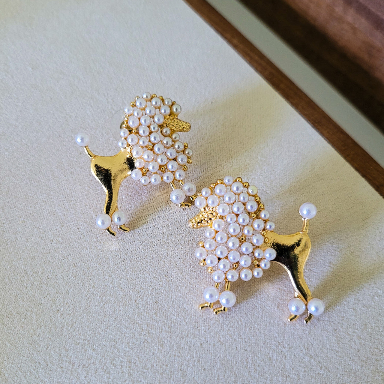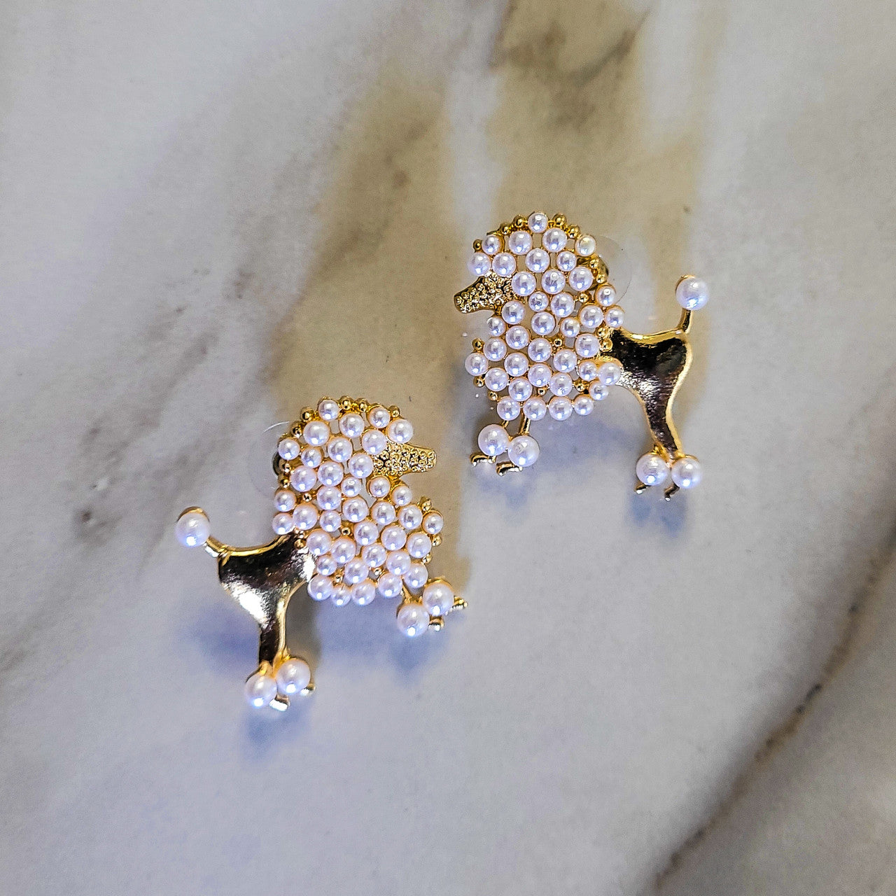 Step into a world of whimsical elegance with the Pearl Poodle Earrings. These charming earrings feature poodle-shaped designs adorned with pearls on the head, tail, and feet, crafted from high-quality gold-plated alloy. Measuring approximately 1 1/2 inches tall, these studs offer a playful yet sophisticated addition to your jewelry collection. Add a touch of unique flair to your ensemble with these delightful and stylish earrings.