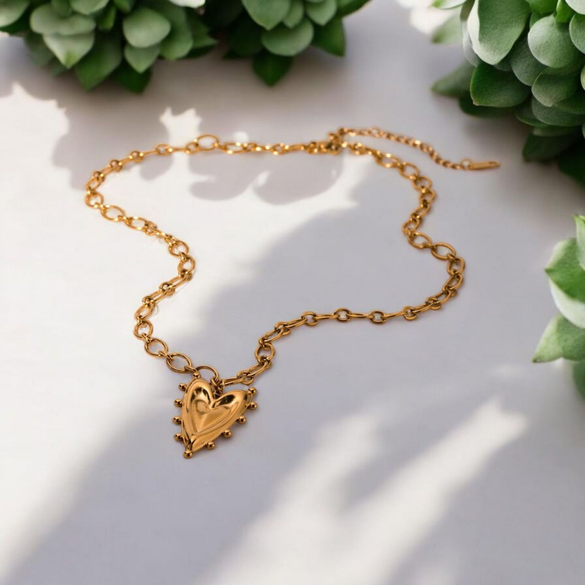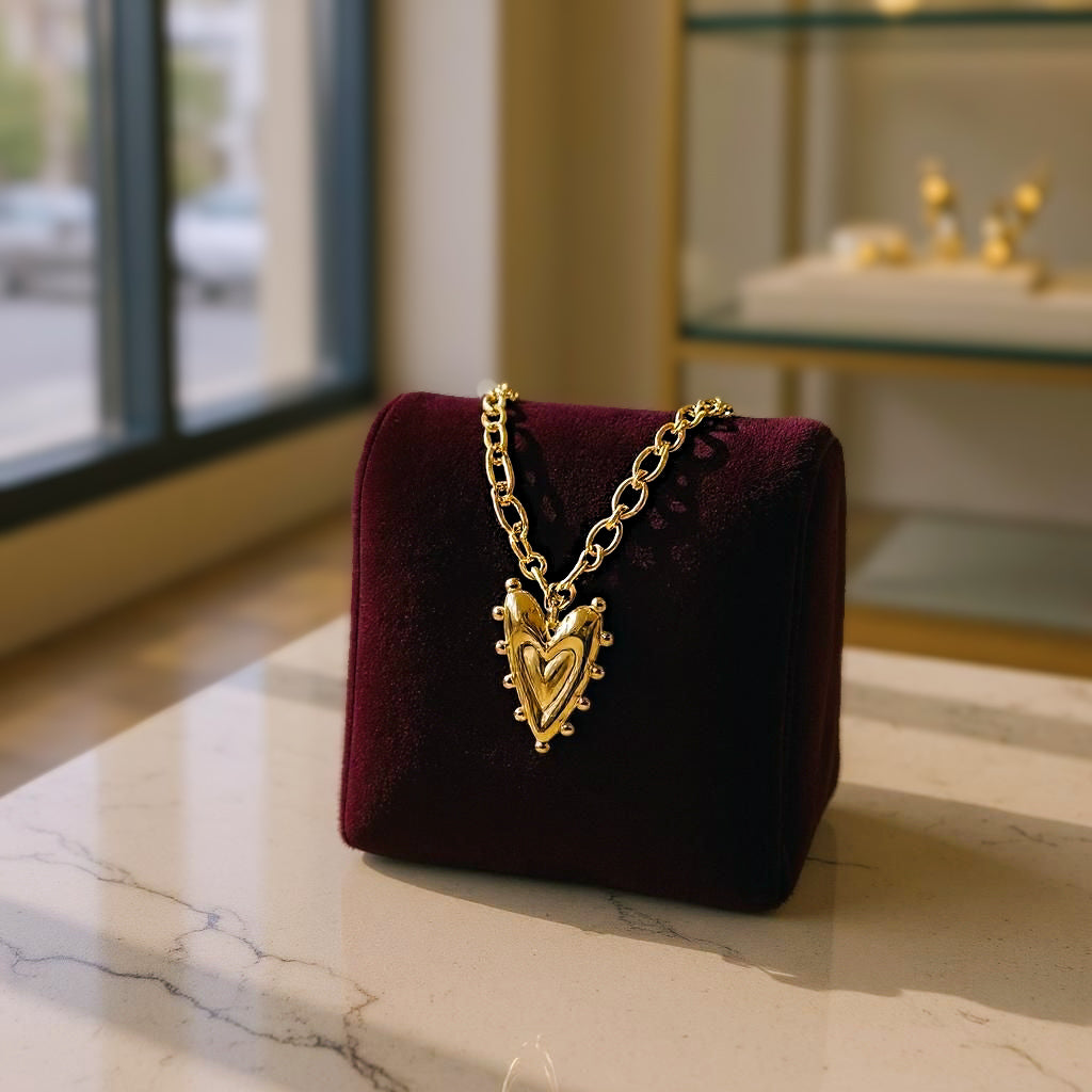 Inspired by timeless devotion and bold expression, the Sacred Heart Drop Necklace features a radiant heart-shaped pendant adorned with polished golden bead detailing. Suspended from a dainty yet durable chain, this 18-inch necklace with a 2-inch extender is crafted to rest close to the heart—where meaning and style meet. Wear it alone as a statement of strength and grace or layer it for divine drama.