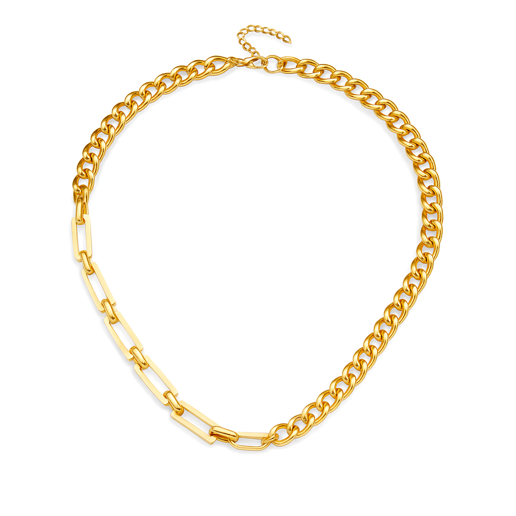 The Linked Legacy Necklace redefines classic with bold rectangular links balanced by timeless curb chain detail. Designed for everyday power dressing or evening edge, it’s a conversation starter layered or solo.