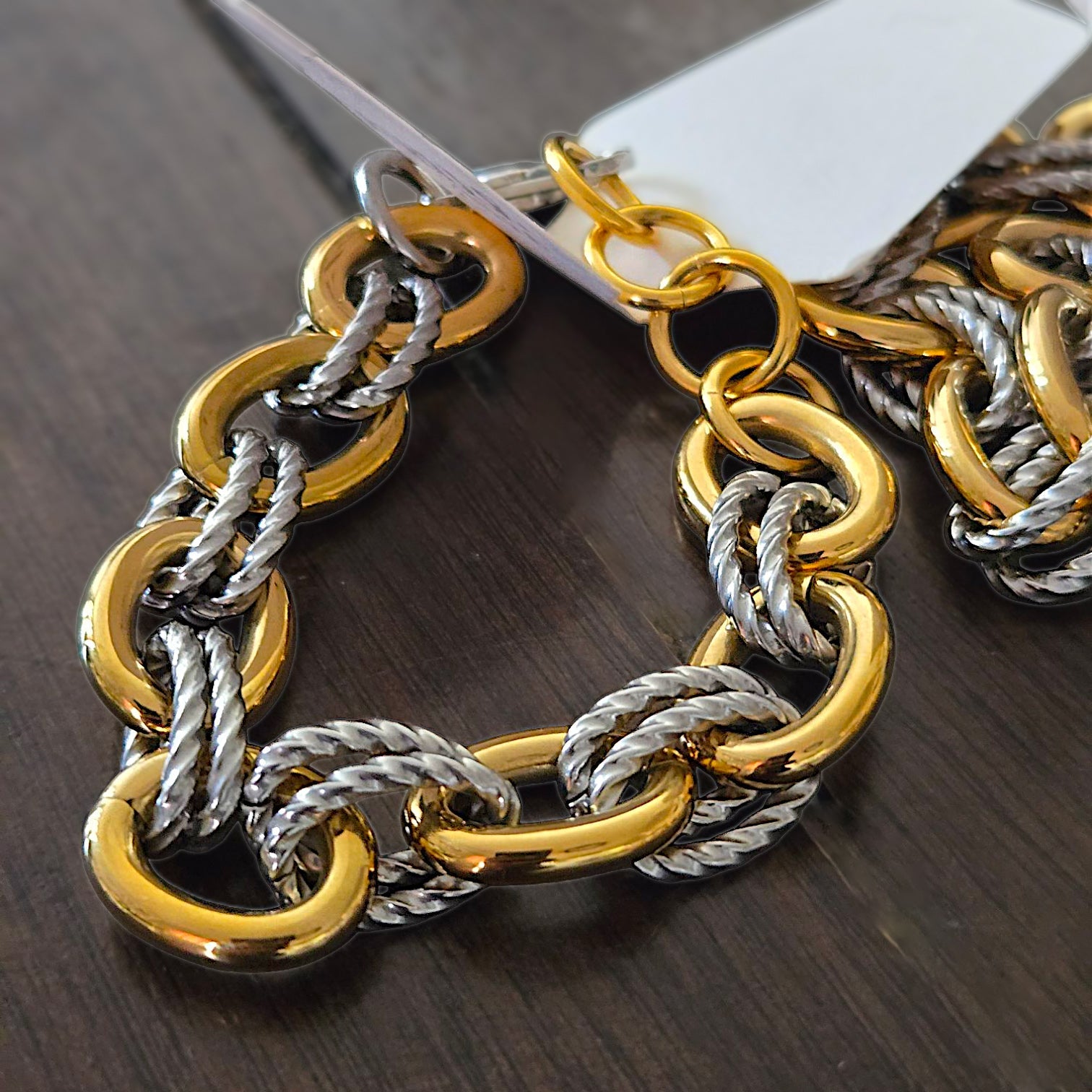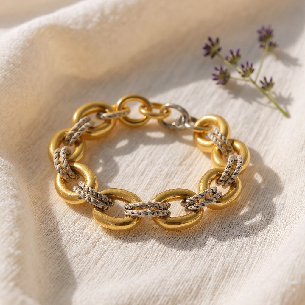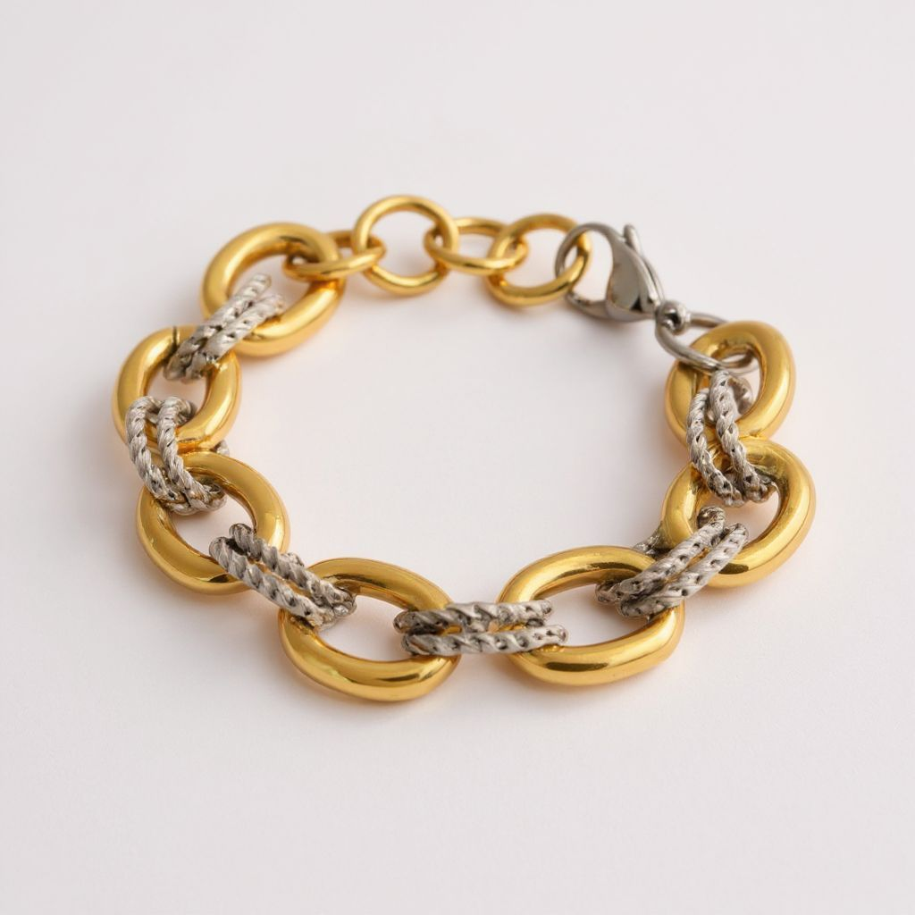 The Twist Links Bracelet offers the same bold design in a wearable, everyday length. Featuring golden oval links woven with twisted silver detail, this piece symbolizes both connection and resilience. Its durable stainless steel and PVD gold plating make it perfect for everyday elegance without compromise.